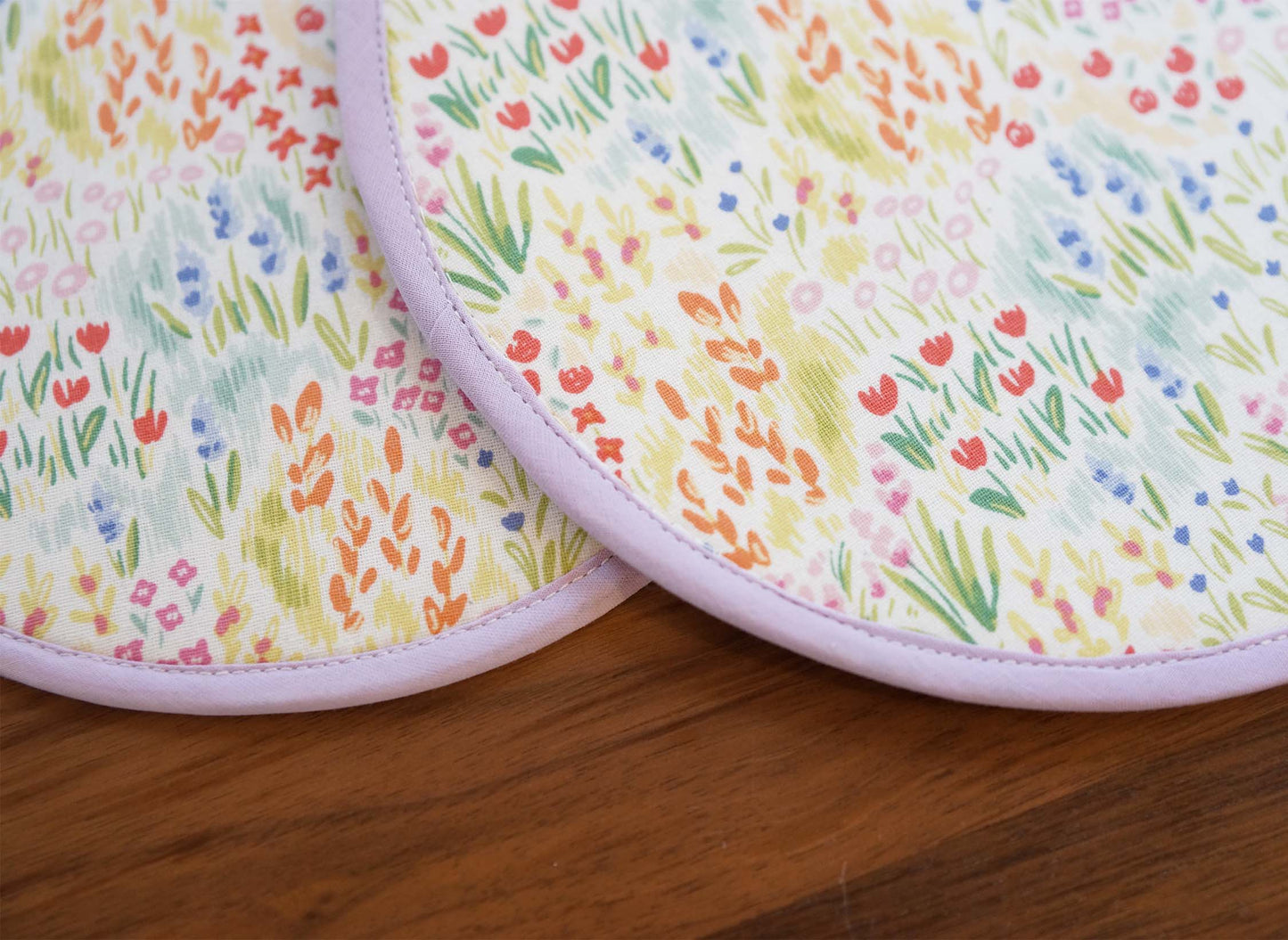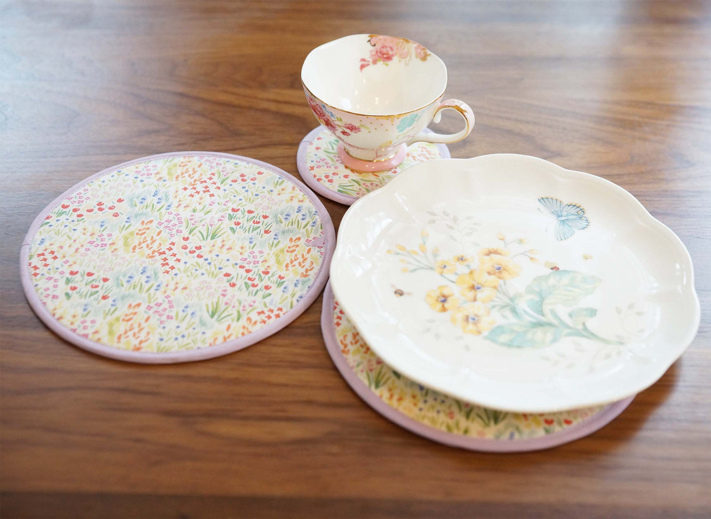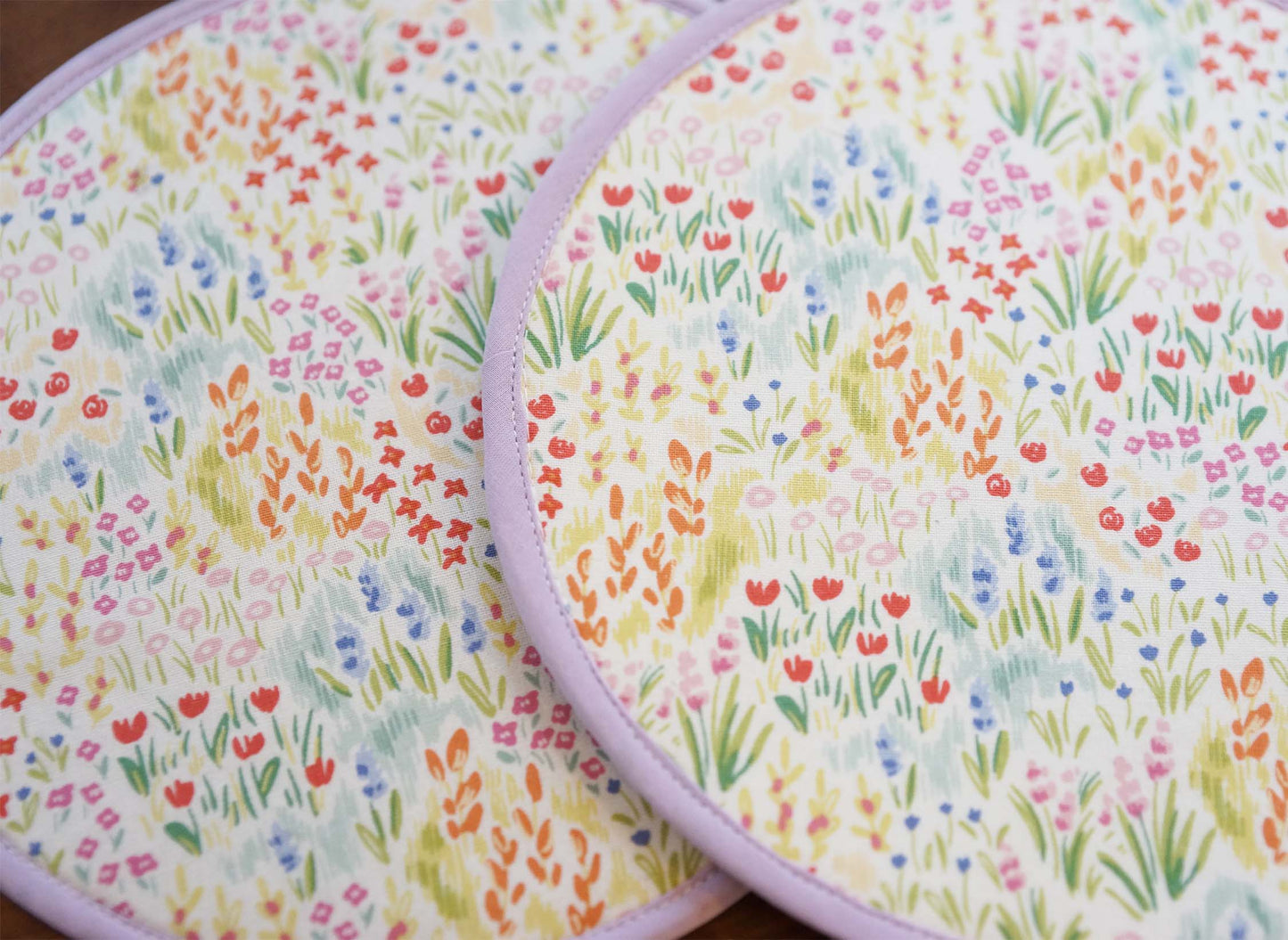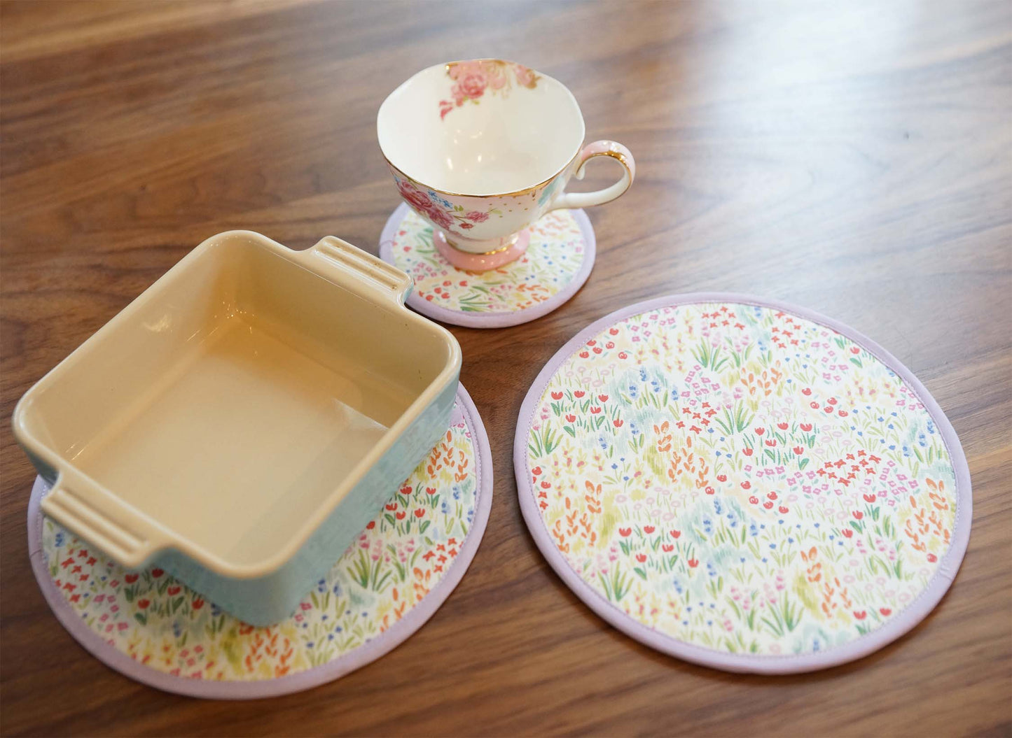 This handmade reversible round fabric trivet is a great addition to your home. The trivets are composed of three layers. I use the premium Korean Dailylike brand 100% cotton as the exterior fabric. The 300g cotton in the middle layer is quite absorbent and thick enough to protect your furniture. And the trivets are sewn with a 0.3’’ wide binding to give them extra beauty.