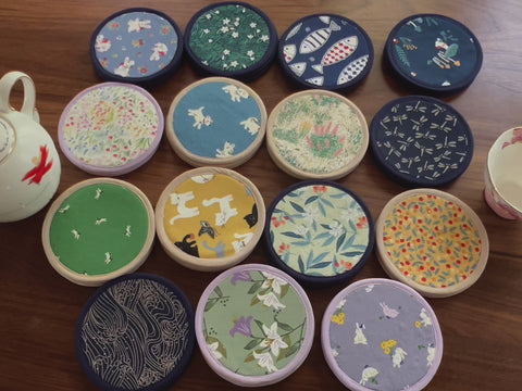 Very cute and chic tea party décor reversible coasters. The coasters are composed of three layers. I use the premium Japanese fabric with fish print as the exterior fabric. The 300g cotton in the middle layer is quite absorbent and thick enough to protect your furniture. And the coasters are sewn with a 0.3’’ wide navy blue binding to give them extra beauty.
