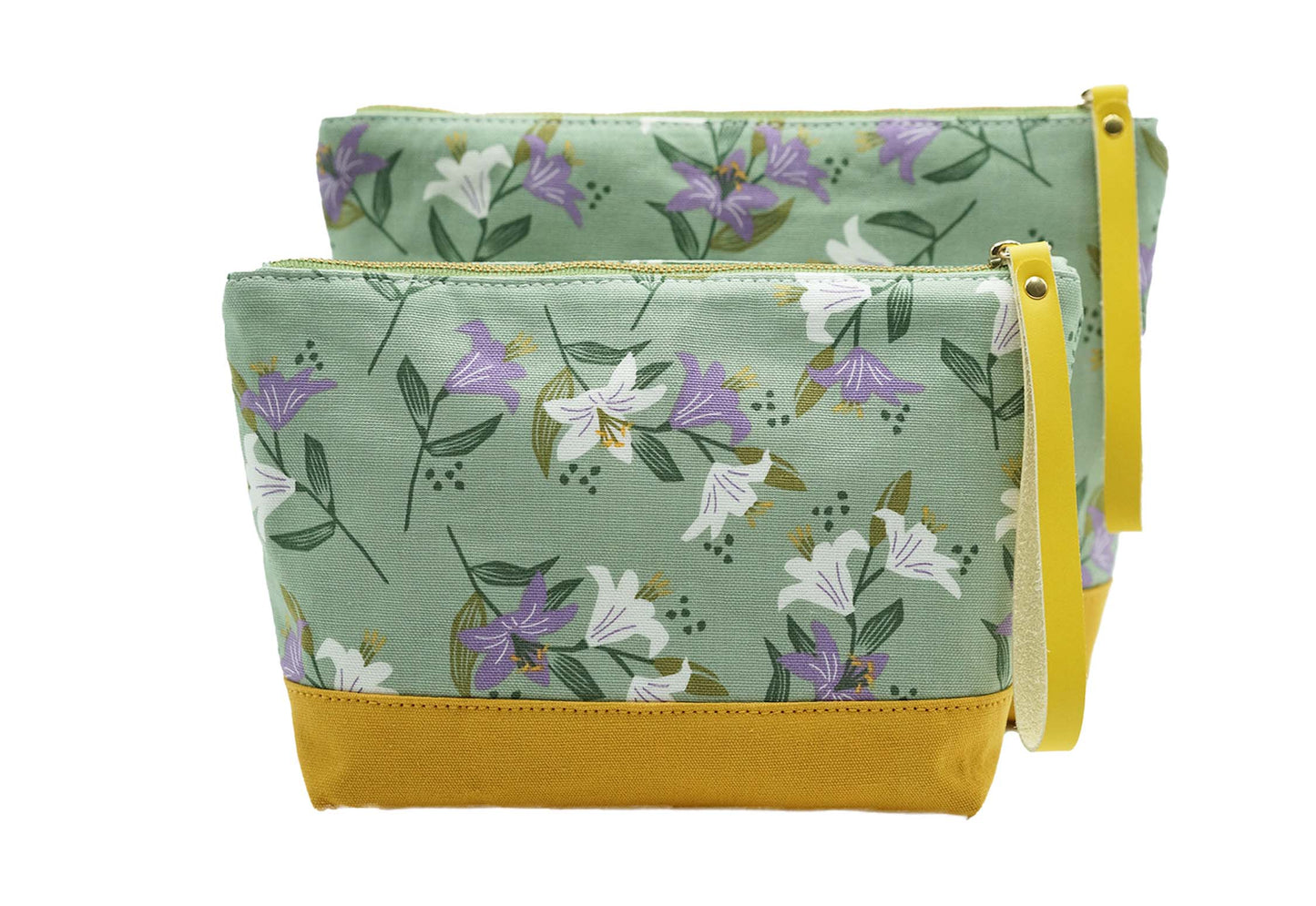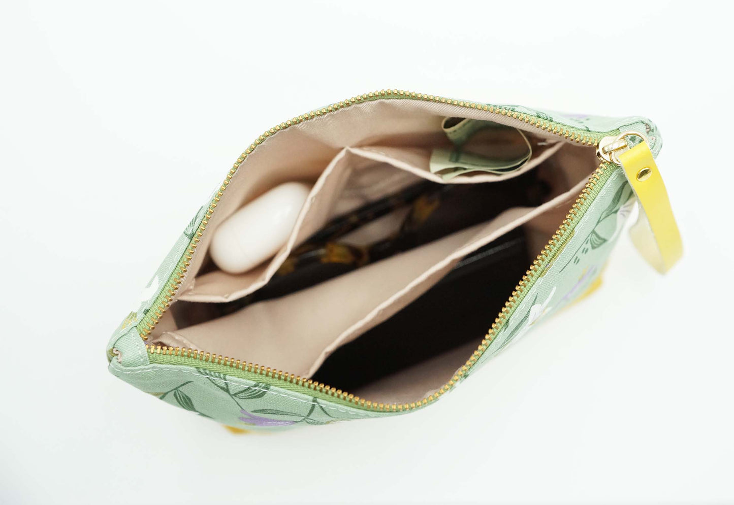 These unique bags are 100% designed and handmade by me. I use premium Korean Dailylike brand 100% cotton canvas fabric as exterior fabric. I hand cut the vegan leather strap and nail to the metal YKK zipper. The color mix and match of zipper, bottom fabric, vegan leather strap and exterior fabric is very pretty. The inside 3 pockets are great for you to organize items.