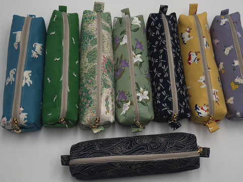 Store a bunch of pens, cosmetics, knitting needles and more in the cute and charming Melbloom handmade pen pouch! This fun pouch is roomy and spacious and has two loops for easy carrying. The pouch has a simple beige with a brass round zipper pull. I use premium Japanese indigo fabric as exterior fabric. The exterior is paired with an interior 100% cotton fabric. Sandwiched between the layers is a medium-weight interfacing for padding and stability.